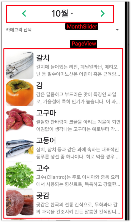 제철음식 알리미는 아래와 같이 MonthSlider와 PageView로 구성되어있다. 여기서 아래 애니메이션과 같이, 두 개의 다른 요소가 서로 상호작용하며 바뀌는 월 정보를 추적해야한다. PageView를 좌우로 스와이프해도 MonthSlider의 월 정보가 바뀌어야하고, MonthSlider의 화살표를 누르더라도 PageView의 내용이 변경되어야한다.