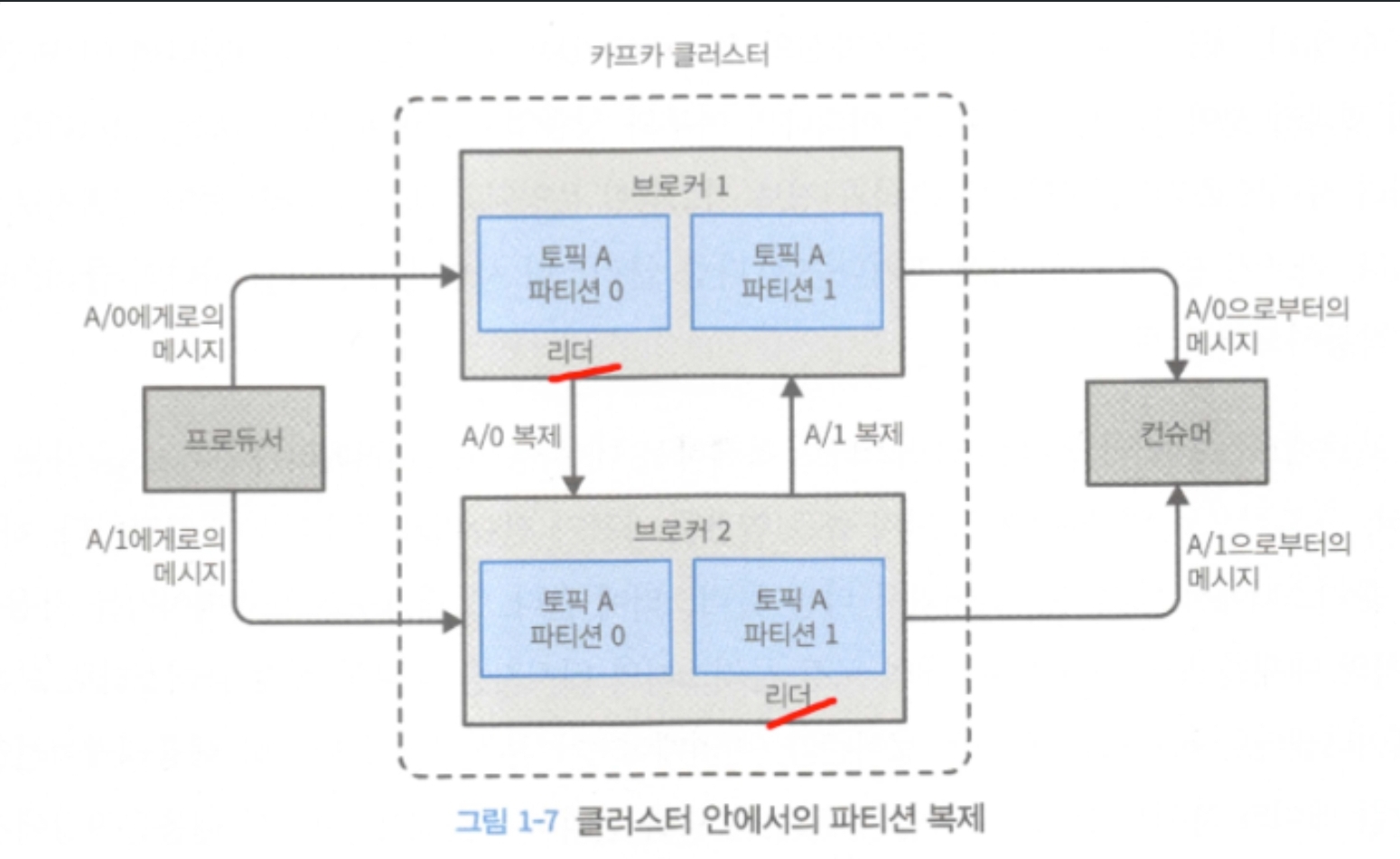 브로커도 클러스터로 구성된다. 여러 브로커에 동일 파티션을 복제해놓고, `리더 브로커`에 장애가 발생했을 때 `팔로워 브로커` 중 하나가 리더 역할을 이어받을 수 있도록 한다. 여러 개의 브로커 중 하나가 `컨트롤러` 의 역할을 하며, 컨트롤러는 파티션을 브로커에 할당해주거나 장애가 발생한 브로커를 모니터링하는 등의 관리 기능을 한다. 파티션이 여러 브로커에 복제되는 경우, 주 파티션을 `파티션 리더(partition leader)`, 나머지를 `팔로워(follower)`라고 부른다.