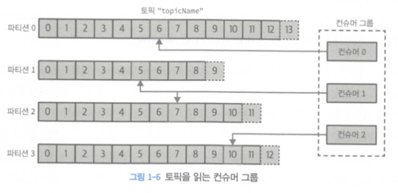 - `스트림(stream)` : 하나의 토픽에 저장된 데이터로 간주되며 프로듀서에서 컨슈머로의 하나의 데이터의 흐름을 뜻함. 14장에서 개략적으로 다룸