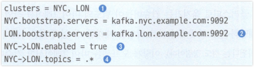- 예를 들어 users 토픽은 샌프란시스코에서는 SF.users, 뉴욕에서는 NYC.users라는 토픽을 두고 운영하며, NYC 데이터센터의 토픽을 샌프란시스코에 미러링하는 경우 NYC.users 라는 토픽을 샌프란시스코에 미러링하여 구분하면 순환 미러링이 방지될 수 있다