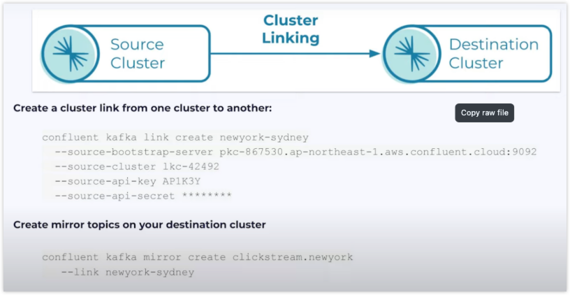 - 클러스터 링킹: 서로 다른 클러스터간 토픽 설정, 파티션, 컨슈머 오프셋, ACL 등 모두를 동기화한다. 미러링되는 토픽들은 대상 클러스터에서 읽기 전용으로 표시되어 쓰기 작업이 불가능하다.