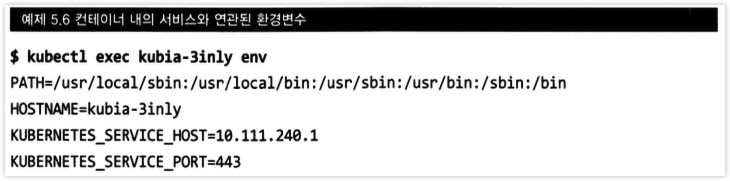 파드가 시작되면 쿠버네티스는 해당 시점에 존재하는 각 서비스를 가르키는 환경변수 세트를 초기화 한다. 클라이언트 파드를 생성하기 전에 서비스를 생성하면 해당 파드의 프로세스는 환경변수를 검사해 서비스의 IP 주소와 포트를 얻을 수 있다.