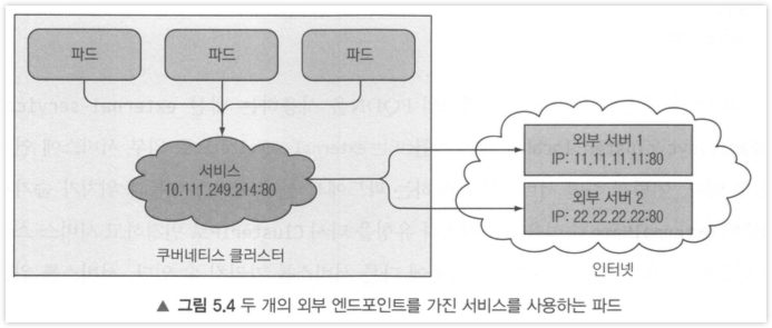 - 서비스가 클러스터 내에 있는 파드로 연결을 전달하는 것이 아니라, 외부 IP와 포트로 연결을 전달하도록 설정할 수도 있다.