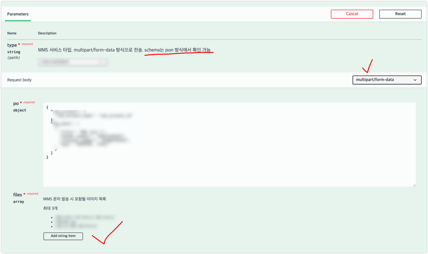 이 때 consumes에 MediaType.MULTIPART_FORM_DATA_VALUE만 지정하면 Swagger에서 Schema를 볼 수 없다. po 타입 안에 @Schema를 사용하여 설명들을 적어놨는데, 이런 스펙에 대한 설명이 모두 사라지게 되면 Swagger를 사용하는 의미가 없게 된다.