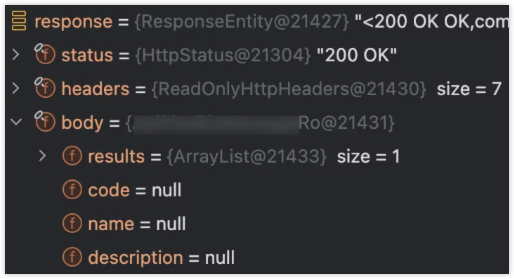 Ro 객체로 응답을 지정하고 있었는데, body의 마지막 데이터들이 results가 아닌 code, name, description 속성값들이 모두 null로 오고 있었다. json에는 null이 없으므로 null이 맨 마지막에 오면 역직렬화 시에 위와 같이 불완전한 parsing이 일어날 수 있다.