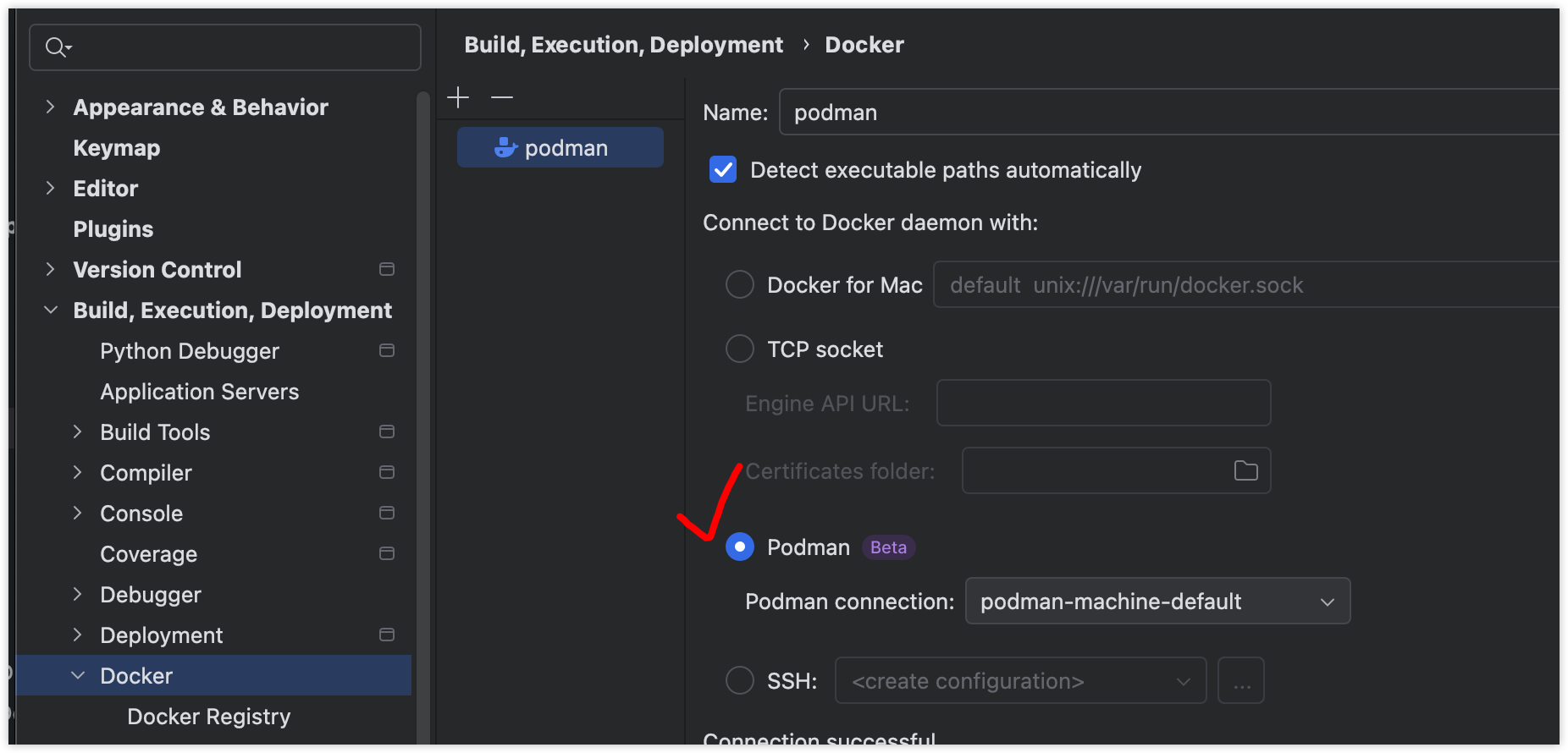 Settings -> Build, Execution, Deployment -> Docker에 들어가서 podman을 추가한다.