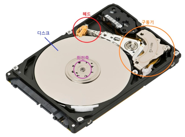보조기억장치인 HDD(Hard Disk Drive), SSD(Solid State Drive)는 영구적으로 데이터를 저장한다. HDD는 원판 모양의 플래터를 회전시키고, 물리적으로 데이터에 접근해야하는 반면, SSD는 움직이는 부품이 없어서 HDD에 비해 속도가 빠르다.