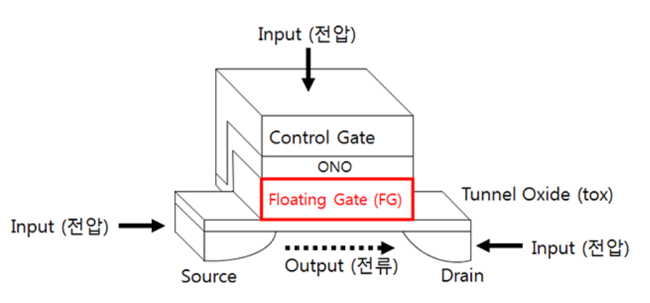 SSD는 RAM과 같이 전기적인 방식으로 데이터를 저장하지만, NAND flash라는 기술을 응용하여 저장하기 때문에 일시적으로 데이터를 저장하는 것(휘발성)이 아니라 영구적(비휘발성)으로 데이터를 저장한다. 이것은 MOSFET과 같은 트랜지스터의 원리를 활용한 것이다. MOSFET의 구조에 Floating Gate(FG) Layer를 추가해서 전자를 가둬둠으로써 데이터가 저장되게 하는 원리이다.