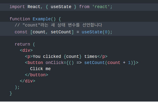 여기서는 useState만 사용하는데, count라는 상태를 정의하고 그것을 기존처럼 setState를 통해서 바꾸는게 아니라