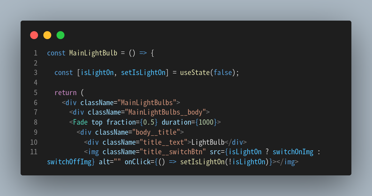 그리고 11번 줄에서 isLightOn이라는 상태를 검사하여 true이면 switchOnImg를 img 태그의 src로 가져오고, false이면 switchOffImg를 src로 가져도오록 하였다.
