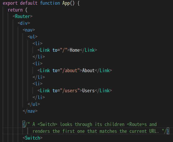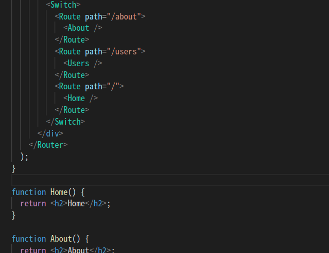 Switch 컴포넌트 > Route 컴포넌트 > 각 페이지(About, Home, Users) 컴포넌트 구조로 만든다.
