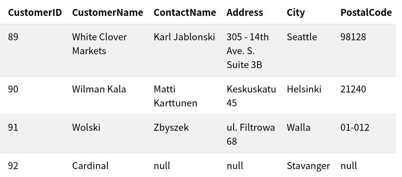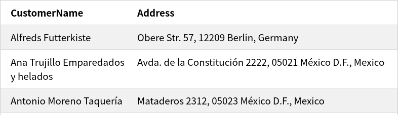 SELECT CustomerName, Address + ', ' + PostalCode + ' ' + City + ', ' + Country AS Address