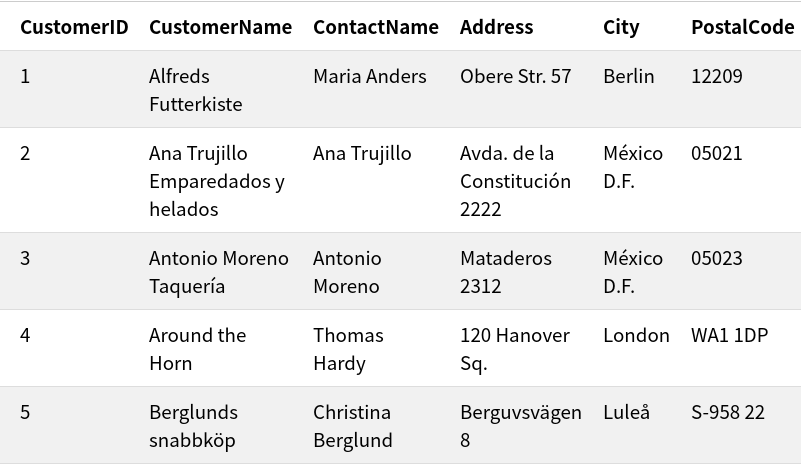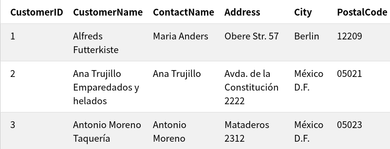 ex) 아래 Database에서 1열(CustomerName = 'Alfreds Futterkiste'인 열)을 삭제한다.