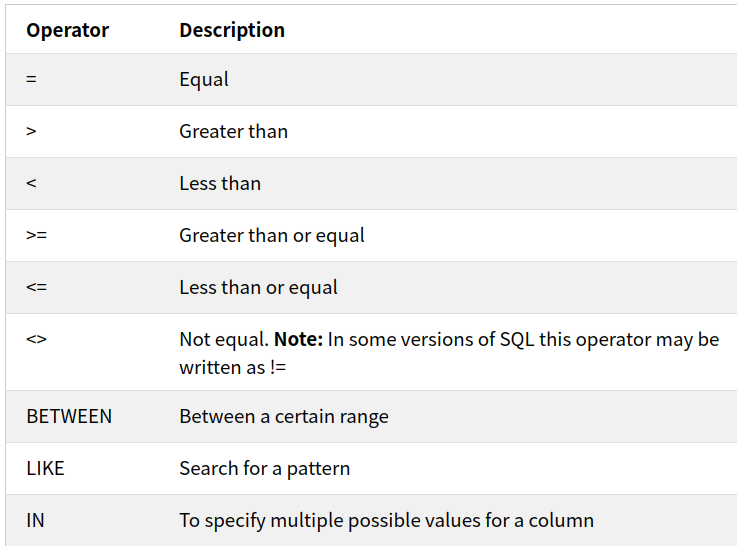 WHERE 명령문에 쓰이는 연산자는 다음과 같다.