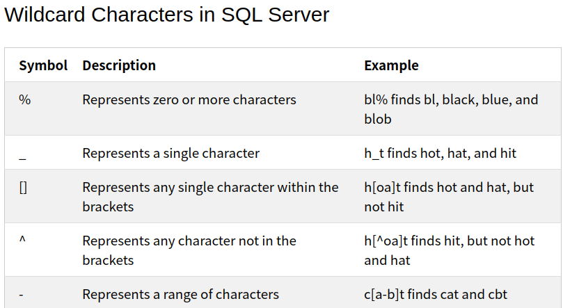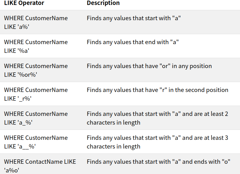 WHERE에 쓰이는 연산자로, %, _ wildcard를 통해 사용된다. 마치 검색창에 특정 문구를 포함하는 검색어를 입력할 때와 비슷한 논리이다.