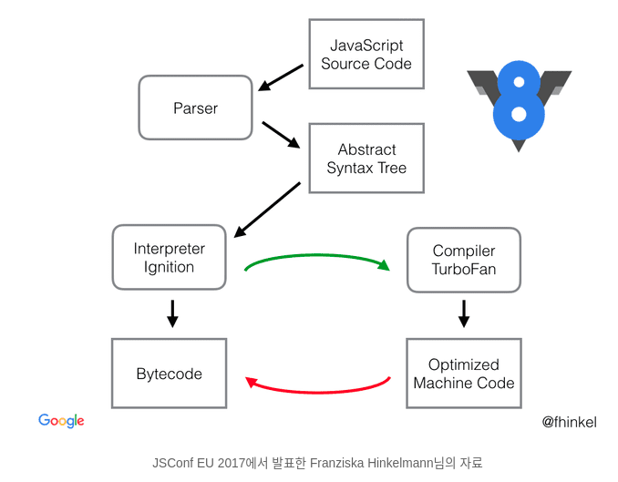 -interpreter 방식은 최적화되지 않았으므로, bytecode로 실행되는 동안 TurboFan이라는 compiler를 통해서 컴파일을 하고 최적화된 기계어로 다시 실행한다. 즉, 반복될수록 코드 실행 속도가 빨라진다.