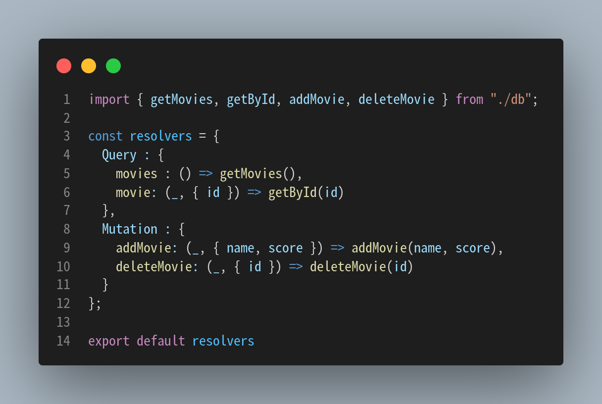 그리고 함수들을 모두 export 처리하여 resolver.js에서 import 후 사용할 수 있도록 하였다. 꼭 db.js에 작성할 필요는 없지만 기능적으로 파일들을 구분해놓은 것 같다.