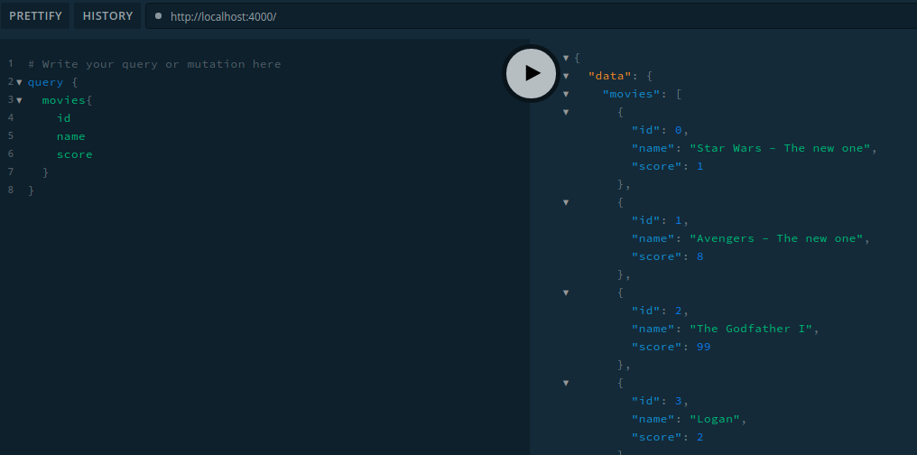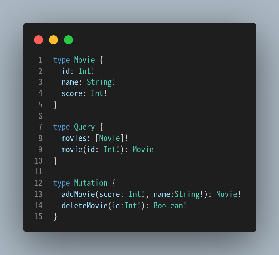 그리고 Query와 Mutation에 쓰일 Movie type을 지정해준다. 이는 마치 데이터가 들어갈 표를 만들어 놓는 것과 같다. id, name, score의 열 이름을 지정하고, 각 열에 들어갈 데이터의 형식(int, string), 필수 입력 여부(!)를 지정해준다.