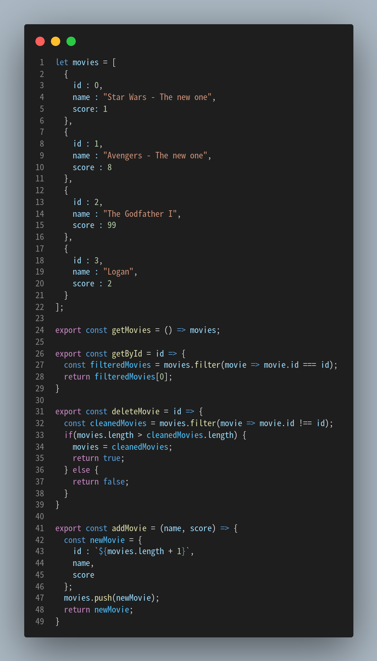 db.js 파일에서는 데이터 객체를 갖는 배열(movies)을 정의하고, resolver.js에서 쓰일 함수들을 정의하였다.