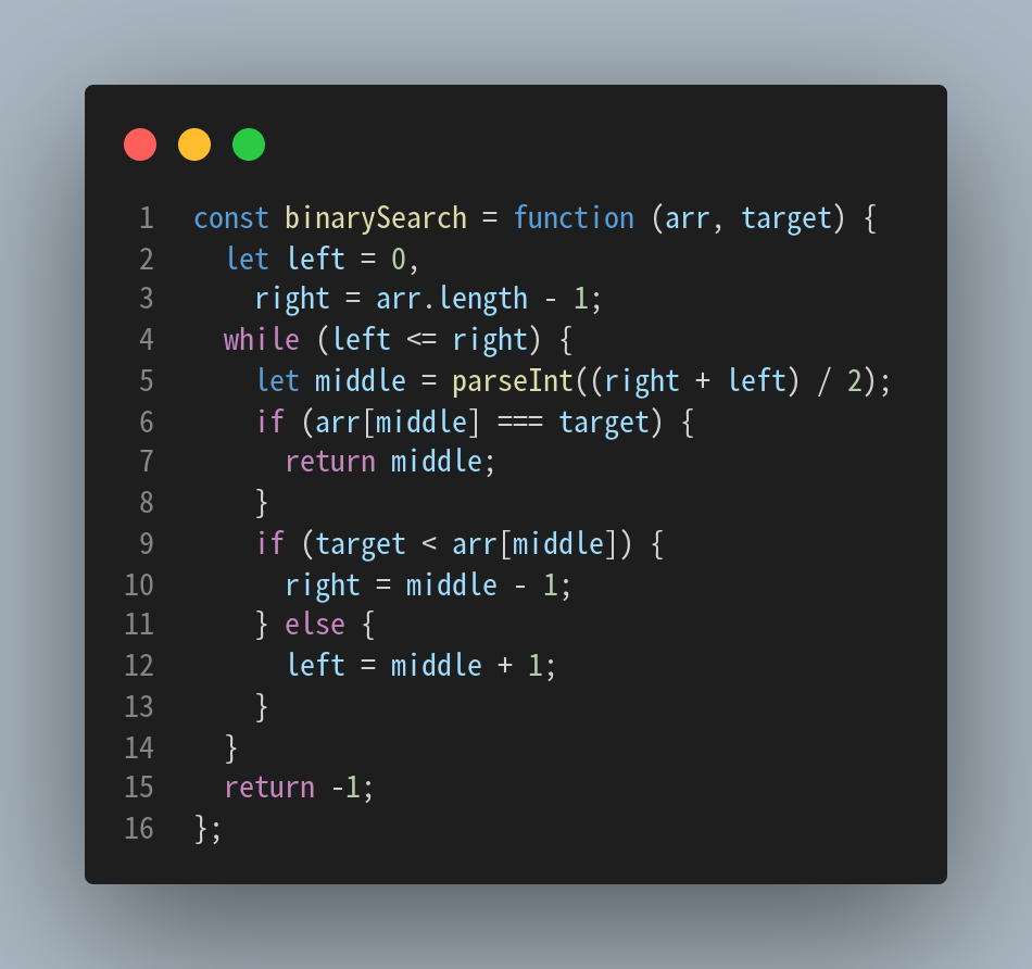 let output = binarySearch([0, 1, 2, 3, 4, 5, 6], 2); console.log(output); // --> 2 output = binarySearch([4, 5, 6, 9], 100); console.log(output); // --> -1