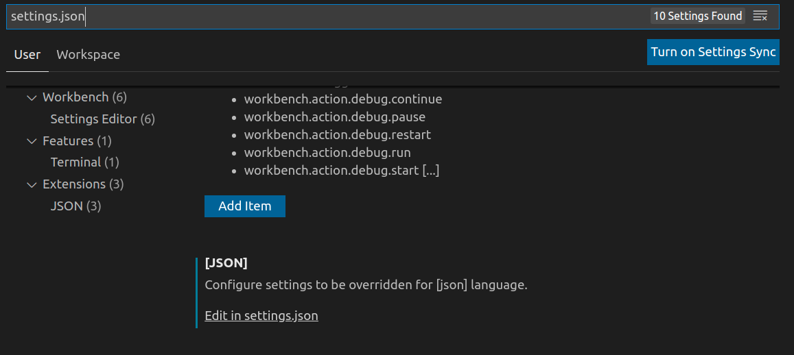 4) 아래쪽에 Edit in Settings.json 링크를 클릭한다.