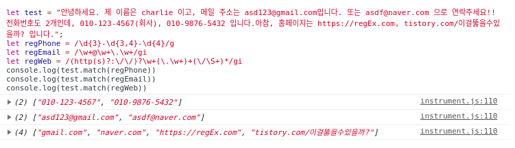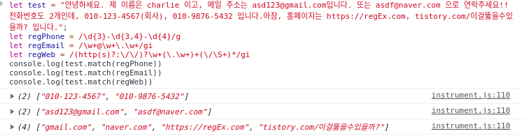 let test = "안녕하세요. 제 이름은 charlie 이고, 메일 주소는 asd123@gmail.com입니다. 또는 asdf@naver.com 으로 연락주세요!! 전화번호도 2개인데, 010-123-4567(회사), 010-9876-5432 입니다.아참, 홈페이지는 https://regEx.com, tistory.com/이걸뚫을수있을까? 입니다.";