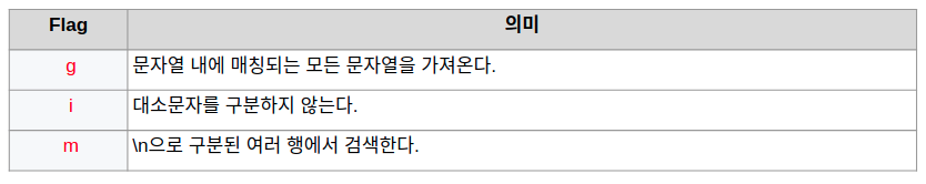 result1은 매칭되는 가장 앞선 문자열의 값과 맨앞의 index를 표현해준다. 또한 re2에서의 g는 전역을 표현하는 flag로, match 메서드와 함께 쓰이면 result2와 같이 매칭되는 모든 인자를 배열로 출력하게 한다.