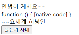 실행 결과를 보면, 차례대로 message, changeMessage 메서드, reverseMessage, 버튼이 출력되는 것을 볼 수 있다. computed 객체에 포함되어있는 reverseMessage는, "안녕하세요"라는 문자가 거꾸로 계산되어 반환되도록 설정되어있으므로 미리 계산된 값인 "요세하녕안"이 출력된 것을 확인할 수 있다. changeMessage 메서드는 정말 함수 자체가 출력된 것에 비해서, computed 내부의 reverseMessage 메서드는 메서드의 리턴값이 출력되었다는 것에도 유의하자.