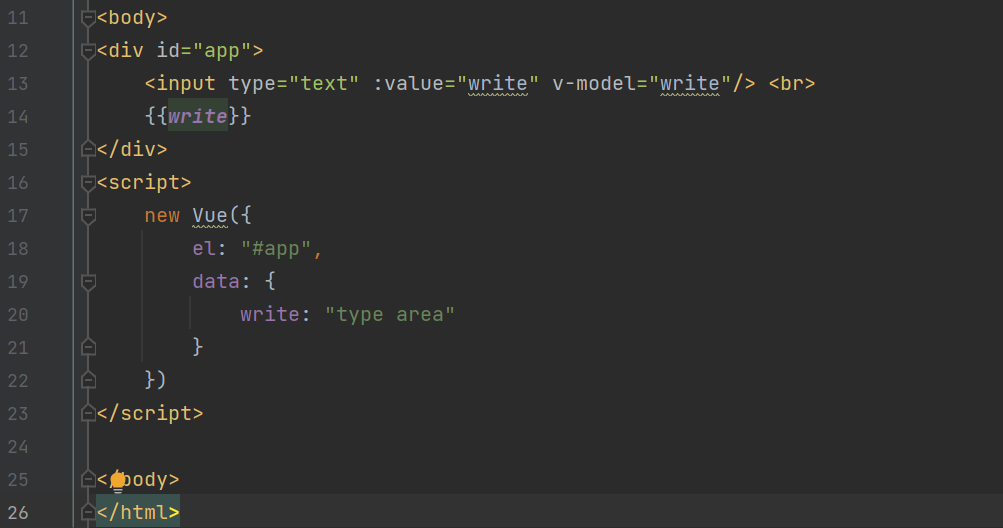 그런데... Vue.js에서는 이러한 코딩 방식을 획기적으로 줄여주는 '양방향 데이터 바인딩(Data Two Way Binding)' 이라는 방식으로 간편하게 바인딩이 가능하게 해준다! 다시 말해 input 창에 적는 값이 자동으로 data.text값으로 업데이트 되게 하기 위해서, 사용자의 입력값인 input의 value를 write값으로 바인딩 하고, textModifier 같은 메소드를 이용해서 write값을 변경해주는 방식을 하나의 키워드로 해결하는 것이다. 'v-model'이라는 키워드를 사용한다. 아래 코드를 살펴보자.