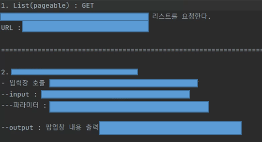 input, output을 명기하고, 필요한 파라미터, URL, http method, 변수 validation, 핵심 로직 등을 적어놓는다.