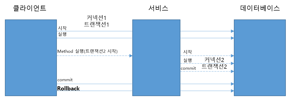 트랜잭션은 클라이언트(app)과 DB간의 연결을 의미하는 커넥션을 기준으로 정의된다. 만약 아래의 그림과 같이 각 커넥션 1, 2를 따라 트랜잭션이 발생하는 과정을 생각해보자. 트랜잭션1 내부의 method에 의해서 커넥션2, 트랜잭션2가 실행되고 commit된 상황이라면 마지막에 트랜잭션1을 롤백하더라도 트랜잭션2의 commit 사항은 롤백되지 않는다. 이것은 트랜잭션의 범위가 커넥션을 기준으로 하기 때문이다.