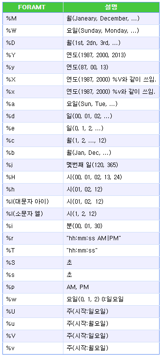 아래 표에서의 FORMAT을 지정하여 날짜의 특정값을 뽑아낸다. 자세한 내용은 참조3)