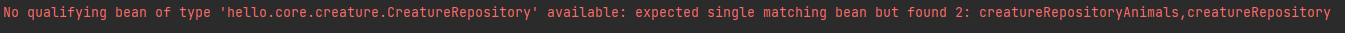에러가 발생한다. 자동으로 스캔된 creatureRepository 빈을 조회하는 것인지, 수동으로 등록한 creatureRepositoryAnimals를 조회하는 것인지 알 수 없기 때문이다.