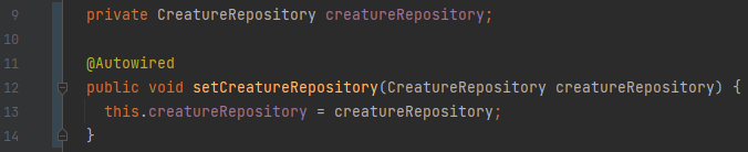 필드 자체에 그대로 주입하는 방법이다. 코드가 매우 간결하지만, 외부에서 변경할 방법이 아예 없게 되어 권장되지 않는 방식이다. 예를 들어 테스트 코드에서 creatureRepository를 DB와 연결되지 않은 로컬 레포지토리로 또는 mock 객체로 지정하여 repository상에 데이터를 넣어보고 싶어도 불가능하게 된다.