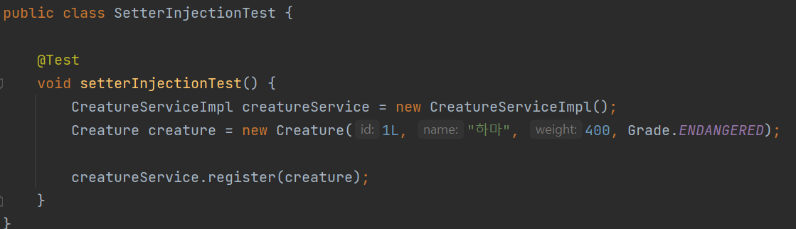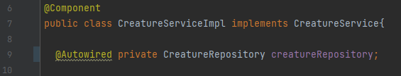 아래 코드와 같이 수정자 주입을 해보자. CreatureServiceImpl 코드에서 Creature를 등록하기 위해 creatureRepository.register 메소드를 불러오려면, creatureRepository를 불러와야 한다(의존관계 주입을 해야한다).