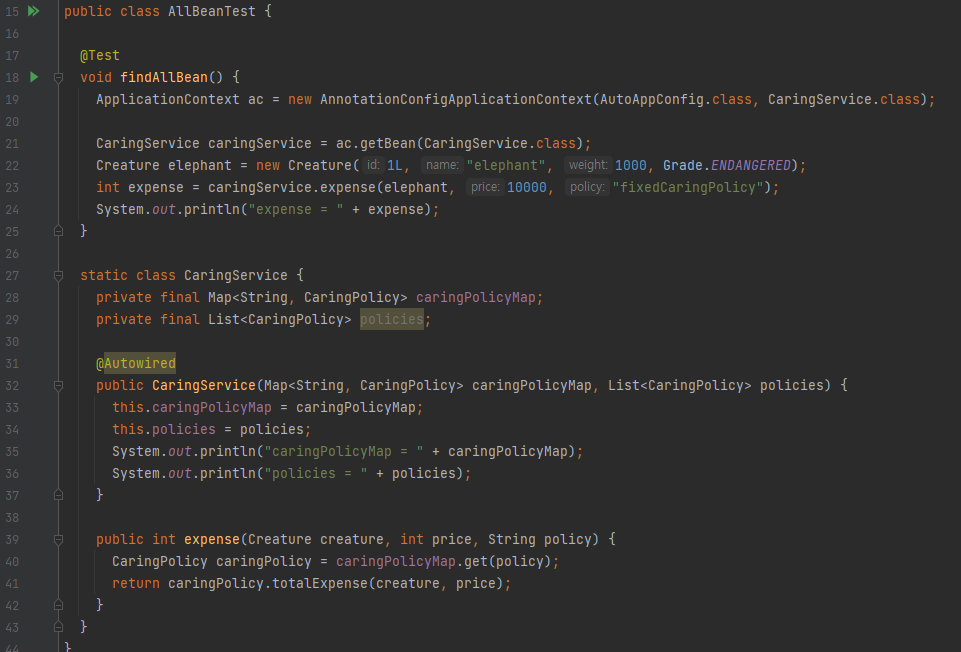 @Autowired로 caringPolicyMap과 policies를 자동 주입받는다. 그리고 CaringPolicy가 @ComponentScan에 의해 스캔되도록 ApplicationContext를 정의할때 AutoAppConfig.class와 CaringService.class를 둘 다 등록하도록 한다. 그리고 Creature, price, policy에 따라서 비용이 산출되는 expense 메서드를 만든다.
