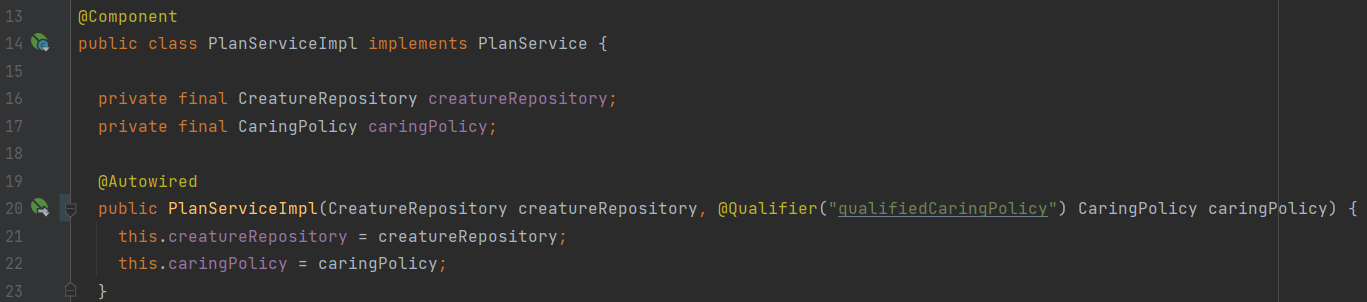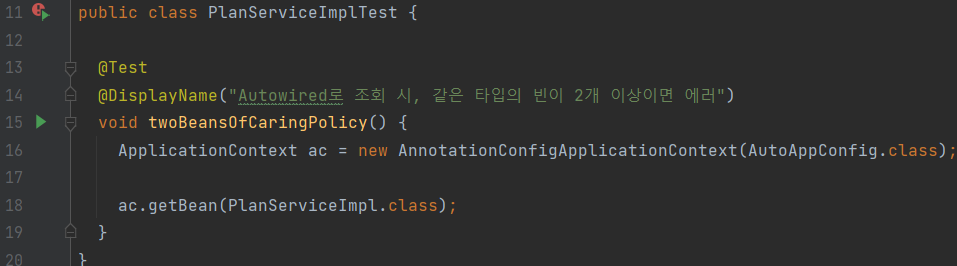 @Autowired는 타입에 해당하는 빈이 여러 개이면, 필드명과 파라미터를 통해 주입될 빈을 찾는다. PlanServiceImpl 클래스의 생성자 부분에서, CaringPolicy의 파라미터명을 fixedCaringPolicy로 변경하고 테스트하면, fixedCaringPolicy가 잘 주입되어 테스트가 통과하는 것을 확인할 수 있다(필드명은 caringPolicy를 하든, fixedCaringPolicy를 하든 상관없다. 생성자의 this.caringPolicy부분과 필드명이 일치하기만 하면 된다).