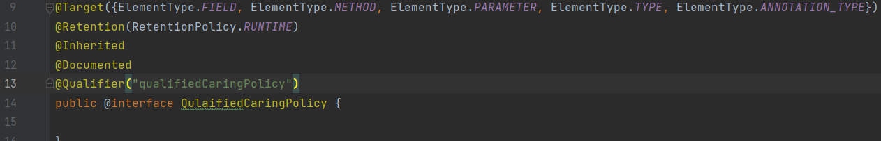 자바 클래스를 만들 듯이, [Alt + insert] 키를 눌러서 어노테이션을 만들 수 있다. 어노테이션은 아래 코드에서 볼 수 잇듯이 @interface라고 표시된다. 해당 어노테이션 위에 @Qualifier 에서 사용하는 @Targer, @Retention, @Inherited, @Documented 어노테이션을 그대로 복사해와서 쓰고, @Qualifier 어노테이션을 이름을 지정하여 사용해준다.
