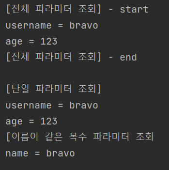 참고로 중복된 key값이 있는 경우는 거의 없고 혹시라도 이런 경우라면 개발자가 반드시 인지하고 있어야 한다. 이렇게 중복된 key값이 있는 경우에는 getParameter()를 사용하면 맨 앞에 있는 파라미터 value가 반환된다.