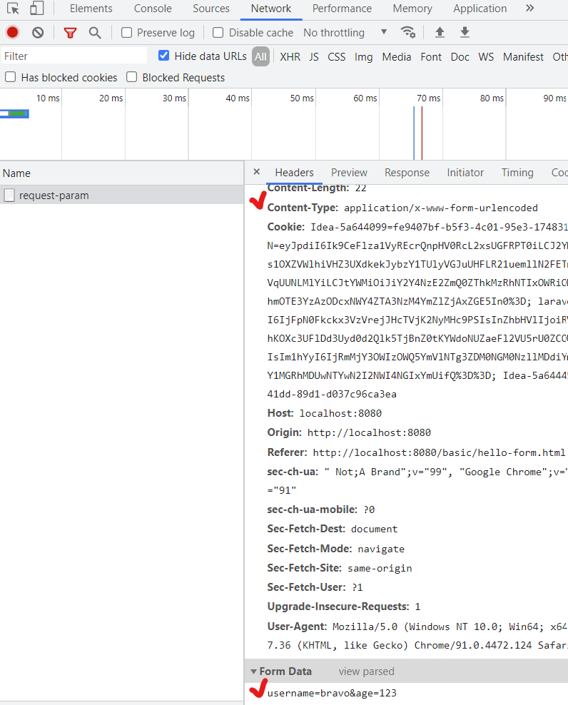 위에서 생성한 html form 양식 데이터에 값을 입력하고 개발자 도구 - Network 탭에서 확인해보면, Content-type ; x-www-form-urlencoded이고, form data로 message body가 입력됨을 확인할 수 있다.