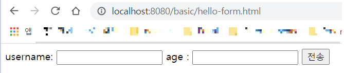 이 때, 해당 파일의 접속 주소는 webapp 디렉토리 아래의 디렉토리명을 포함한다. basic 디렉토리 아래에 hello-form.html 파일을 만들었으므로, 접속 주소도 localhost:8080/basic/hello-form.html 이 된다.