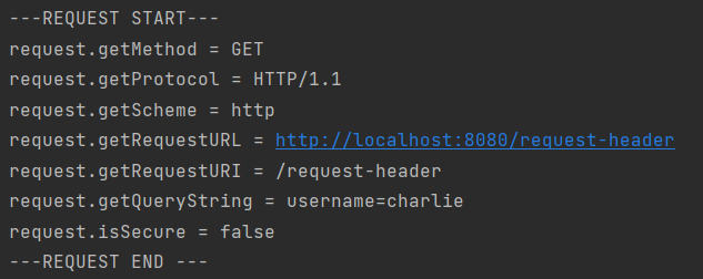 HttpServletRequest에서는 아래와 같은 다양한 메서드를 제공한다. 브라우저에서 localhost:8080/request-header?username=charlie 로 접속하여 결과를 출력해보자. 그리고 출력 함수를 [Ctrl + Alt + m] 단축키로 printStartLine이라는 메서드로 뽑아내자.