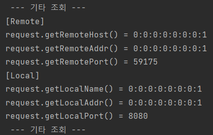 마지막으로 기타 정보를 조회해보자. 네트워크 커넥션의 정보를 바탕으로 Remote는 요청이 오는 곳의 정보, Local은 구동 중인 내 서버의 정보를 표시해준다.