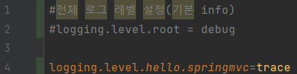 레벨을 설정하여 특정 레벨 이상의 로그만 출력되도록 할 수 있다. 기본적으로 "logging.level.root = info" 라는 설정으로 되어 있기 때문에, info, warn, error 정보만 출력되게 된다. 그러나 "logging.level.패키지이름 = trace" 설정을 통해 trace 레벨 이상인, 모든 로그를 출력하도록 할수도 있다. resource/application.properties 파일에서 로그 설정을 해주면된다. root는 해당 애플리케이션뿐만 아니라 모든 라이브러리에 적용되므로, root 레벨을 debug로 바꾸면 애플리케이션 실행 시 스프링 등에서의 로그까지 전부 출력되는 것을 볼 수 있다.