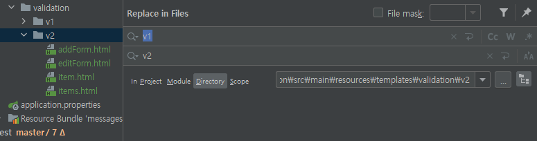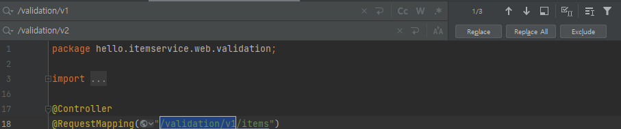 검증을 위한 코드를 개선해본다. 우선 앞선 글에서 작성한 코드를 복사해서 V2 버전으로 만든다. 코드 내에 있는 v1, V1 부분을 v2, V2로 만드는데, 변경을 원하는 코드를 블록하고, [Ctrl + R]을 누르면 intelliJ에서 선택하여 변경, replace All 기능을 제공한다.