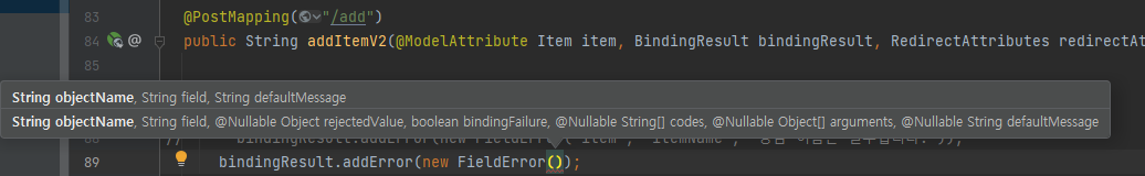 FieldError는 생성자의 종류가 2개이다. 그 중 아래쪽의 생성자를 이용하여 rejectedValue를 추가할 것이다. 어떤 객체의 파라미터를 알아보는 단축키는 [Ctrl + P] 이다.