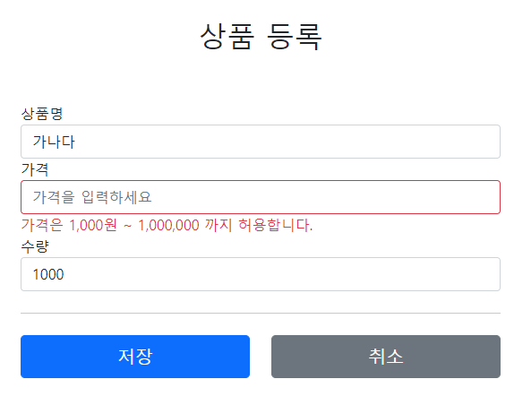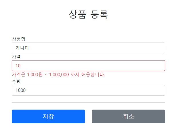 만약 가격 필드만 에러가 발생하도록 10을 입력하면, 가격 필드에 입력한 정보는 사라진다. 이것은 가격 필드에서 발생한 FieldError 객체에 사용자의 입력 정보가 담기지 못한채로 View로 넘어갔기 때문이다.