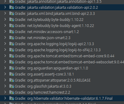 본격적인 사용에 앞서, Bean Validation을 import 해오고 테스트 코드를 통해 어떻게 Bean Validation이 구성되고 사용할 수 있는지 알아본다. 아래 implementation 코드를 build.gradle에 추가하고, 새로고침을 한다. 이후 External Libraries에 보면, hibernate의 validator가 구현체로 추가되어있는 것을 확인할 수 있다.