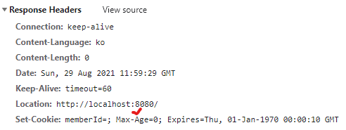 네트워크의 Response Headers에서 cookie가 만료된 것을 확인할 수 있다.