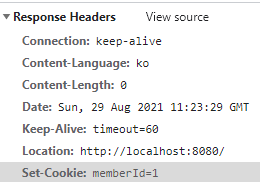 이렇게 작성 후 로그인에 성공하면 Network의 Response Headers 내에 Set-Cookie의 형태로 서버에서 쿠키가 생성되고 브라우저로 전송된 것을 확인할 수 있다.